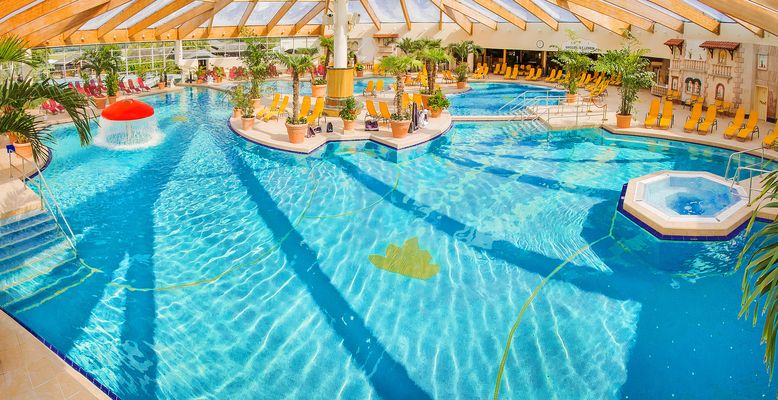 Gönnen Sie Wohlfühlthermengenuss auf fast 12.000 Quadratmeter in 34°C-36°C warmer, eisen- und jodhaltiger Thermalheilsole aus eigener Quelle aus 1018 Metern Tiefe.