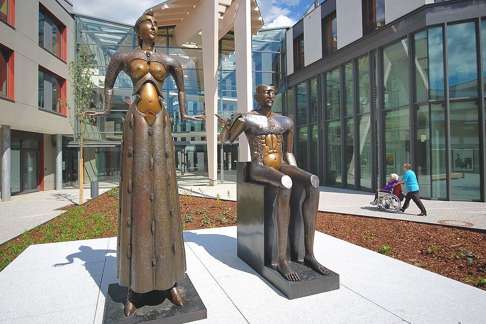 Entdecken Sie – ausgehend vom Hbf. Eberswalde – bei einem Stadtrundgang Kunstwerke und die freie Kulturszene in Eberswalde. Die Bildhauerin Gudrun Sailer, die in der Stadt lebt und dort nach dem Mauerfall die Kunst im öffentlichen Besitz dokumentierte, führt Sie zu Kunstorten in der Innenstadt. Gewürzt mit persönlichen Erinnerungen erfahren Sie von ihr, wie es zur Aufstellung der Skulpturen und «Kunst am Bau» kam, wie sich Kultur in der Stadtgesellschaft entwickelte und wie das Musikfestival «Jazz in E.» entstand. Nach einem Mittagessen im Restaurant geht’s ins Paul-Wunderlich-Haus: Gudrun Sailer führt Sie durch die Sammlung des international bekannten Malers und Bildhauers. Paul Wunderlich, stilbildender Meister des phantastischen Realismus und der Lithografie, wurde in Eberswalde geboren.
