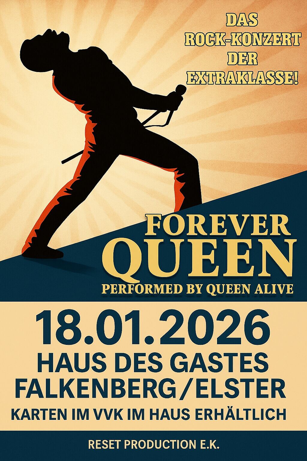 Mit beeindruckender Bühnenshow, Lichtdesign, Videos und einem charismatischen Sänger bringt FOREVER QUEEN die Magie von Freddie Mercury & Co. zurück.